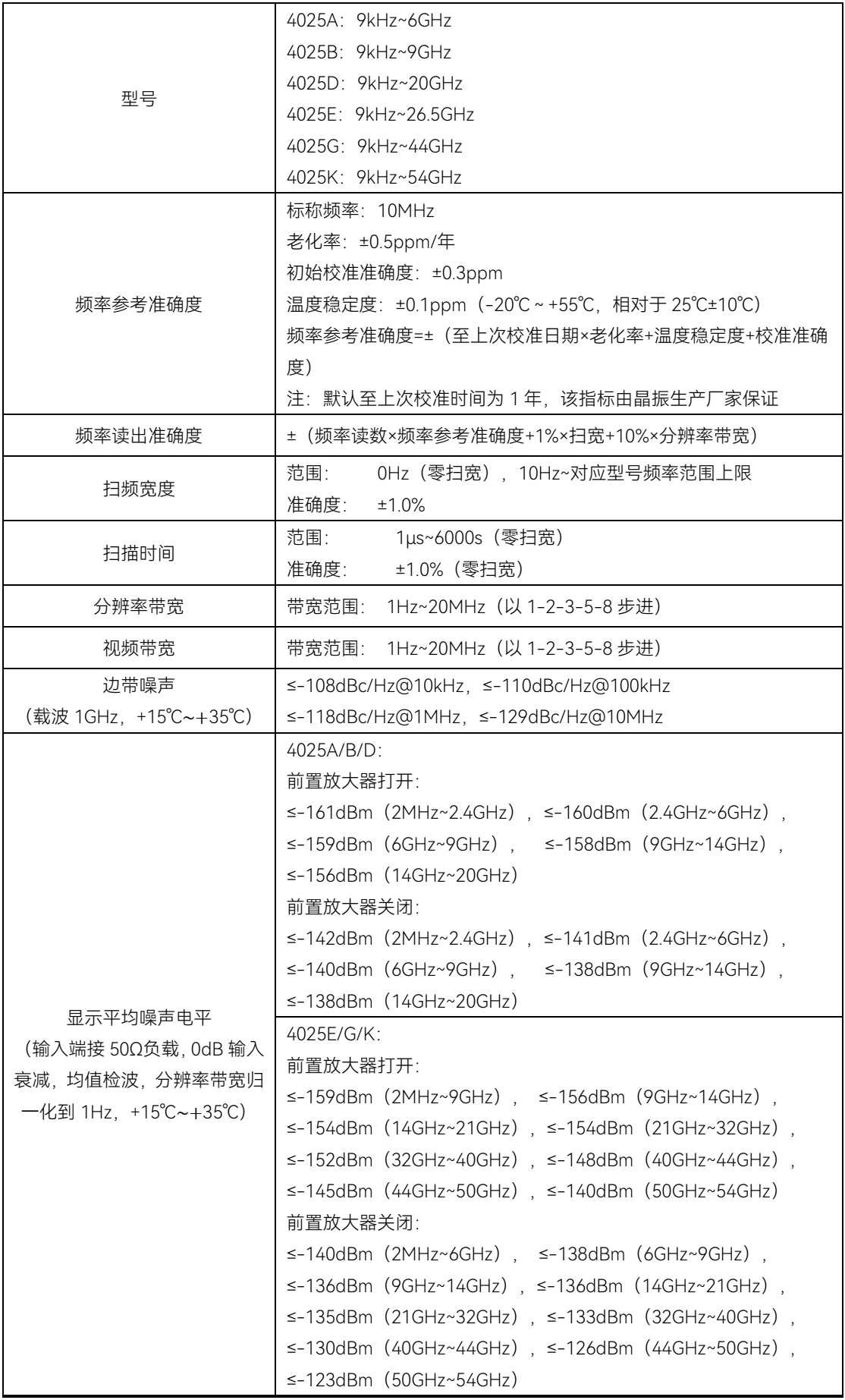 ⚫ 射频性能指标显示平均噪声电平: ≤-165dBm/Hz(2MHz~2GHz, 前置放大器开, 4025A/B/D 典型值) ≤-163dBm/Hz(2MHz~2GHz, 前置放大器开, 4025E/G/K 典型值)单边带相位噪声: ≤-113dBc/Hz@100kHz 频偏@1GHz 载波(典型值) ≤-108dBc/Hz@100kHz 频偏@10GHz 载波(典型值)三阶交调失真: +16dBm@900MHz(典型值)总电平不确定度: ±1.0dB(典型值)